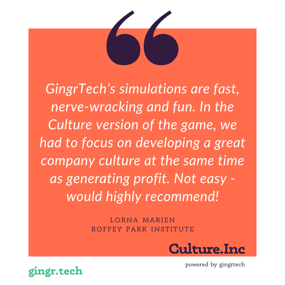 "Immersive Edges’s simulations are fast, nerve-wracking and fun. In the Culture version of the game, we had to focus on developing a great company culture at the same time as generating profit. Not easy - would highly recommend!"